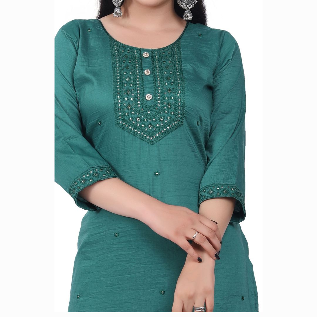 Add elegance and sophistication to your ethnic collection with the LOR Fashion Straight Kurta crafted from premium Rinkle Chinon Silk fabric. Designed in a refreshing Rama Green shade, this kurta features delicate thread work embroidery along with a classic straight cut for a graceful look. The three-quarter sleeves and lightweight silk fabric ensure both comfort and style, making it an ideal choice for festivals, office wear, and family gatherings.